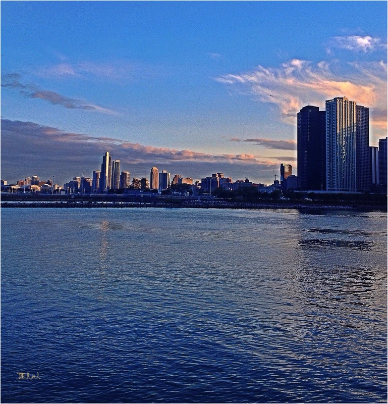 Buildings, sparkling, bask in setting light,